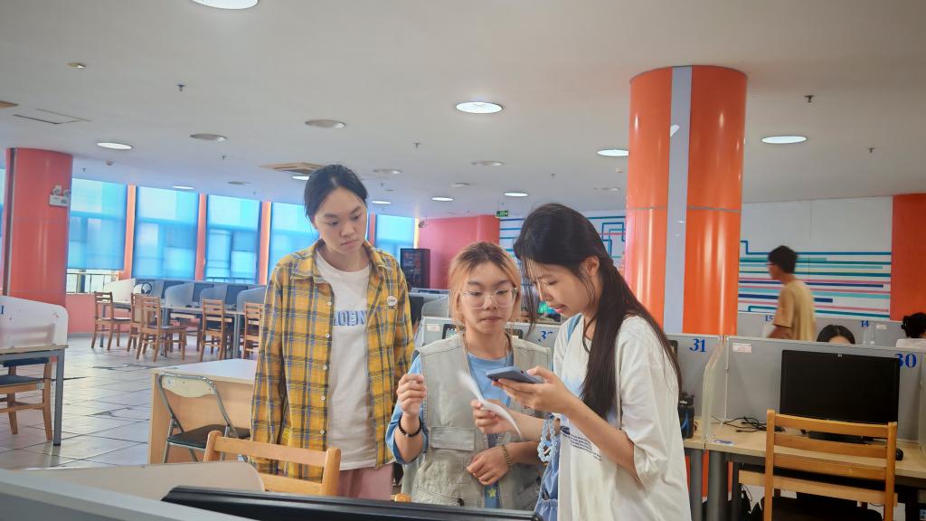 比赛正式开始,60多组参赛队伍在集合点领取了“藏宝地图”后,便开始有趣的寻宝之旅,有序地到各个书库寻找书目。大家按所学的图书检索方法在电脑和手机上认真查找图书,不停穿梭于各楼层书库之间,根据线索灵活运用图书检索技能,精准定位目标书籍。现场只见有的同学驻足在书架前认真挑选,仔细核对;有的同学拿着手机与队友快速核对信息,神情专注;有的同学则在书架间小跑穿梭,争分夺秒。活动过程还巧妙融入图书分类知识问答、音乐空间试听、接力跳绳等趣味环节,现场气氛紧张而热烈,大家兴趣盎然,在知识的海洋中尽情遨游、探索。