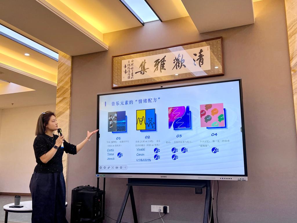 讲座还联系生活实际,提出“音乐元素的情绪配方”,例如健身时搭配高能量歌单激发动力,借助爵士乐、世界音乐激发创意,利用动感歌曲提神醒脑,或通过无歌词音乐和白噪音提升专注力。张老师鼓励大家成为自己生活的“音乐DJ”,通过精心编排歌单,构建个性化的“情绪配方”,在不同场景中实现情绪调节,从而改善情绪状态、提升效率并缓解压力。在最后的“共创歌单”环节,师生们踊跃分享各自的“宝藏歌曲”,现场气氛热烈。
