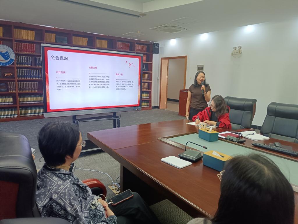 11月24日,图书馆组织全体馆员开展专题党课学习,深入学习贯彻党的二十届四中全会精神。本次学习由图书馆党支部书记、馆长刘佩云主讲。