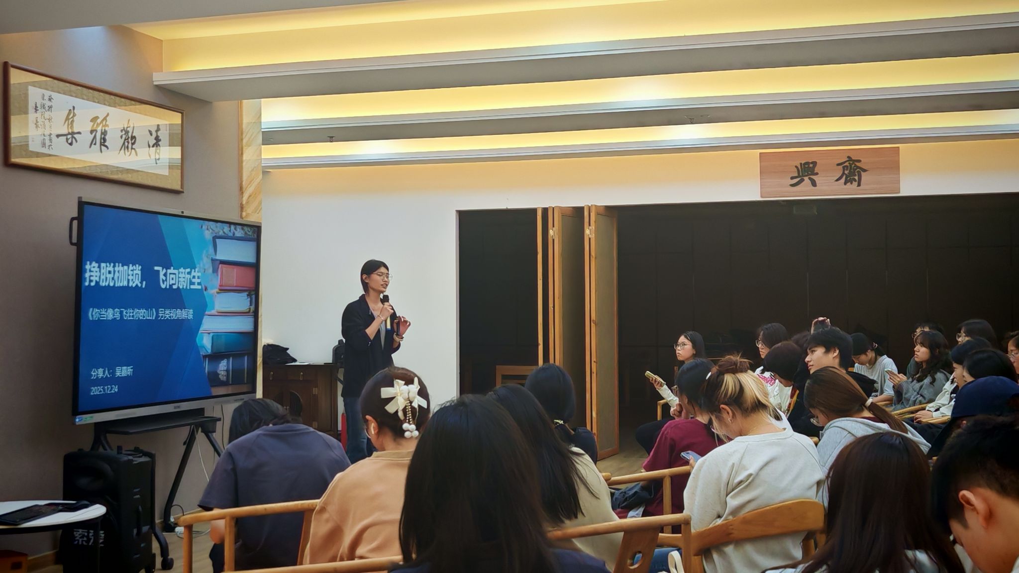 12月23日晚,2025年“读者之星”读书分享会在图书馆二楼传习馆举办,分享嘉宾为邵和月、卢楚晰、杨嘉琦、吴嘉晰、岑韵珊,近60名同学参加了此次活动。