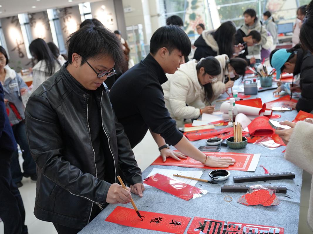 1月7日下午,图书馆组织书法协会的同学,在二楼大厅举行“书香贺岁·翰墨迎春”挥春活动。校党委委员、副校长杨云奇,教育与体育学院教师陈嘉豪等,与数百名师生共同参与,一起感受笔墨之间的文化韵味。