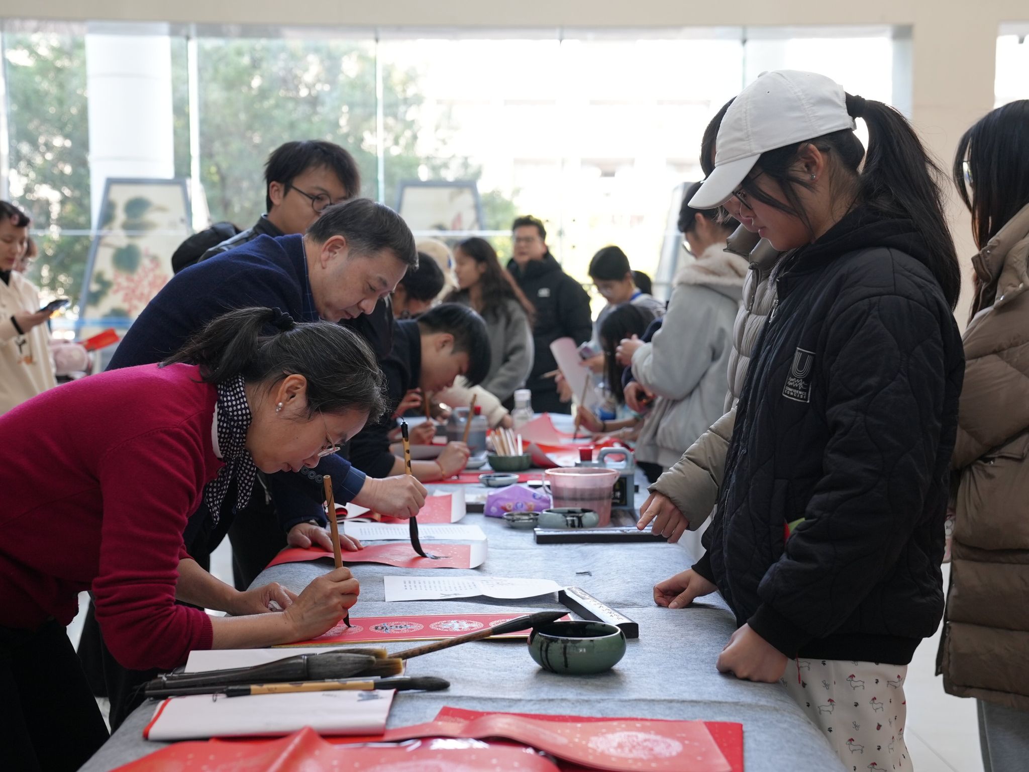 活动现场墨香四溢,书法爱好者们挥毫泼墨,运笔如飞。现场吸引了众多师生,大家或驻足细赏观摩,或主动协助铺纸递墨,更有不少同学提笔体验,写下属于自己的新春祝福。一副副寓意吉祥的春联、一张张饱满的“福”字,渐渐铺满大厅,师生们在翰墨间感受中华传统文化的韵味。活动持续三个多小时,现场气氛温馨热烈,共送出春联与“福”字五百余副。