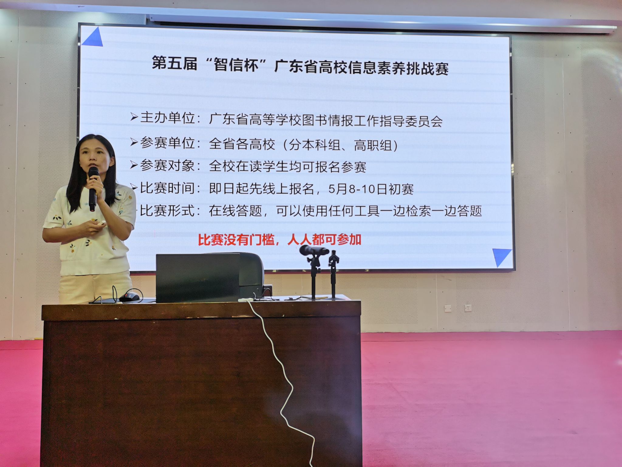 为助力学生备战第五届“智信杯”广东省高校信息素养挑战赛,4月8日下午,图书馆举办赛前专题培训,由吴惠茹老师主讲。培训围绕赛事规则、核心知识点、备赛策略与答题技巧四大板块展开,帮助学生搭建系统备赛框架。